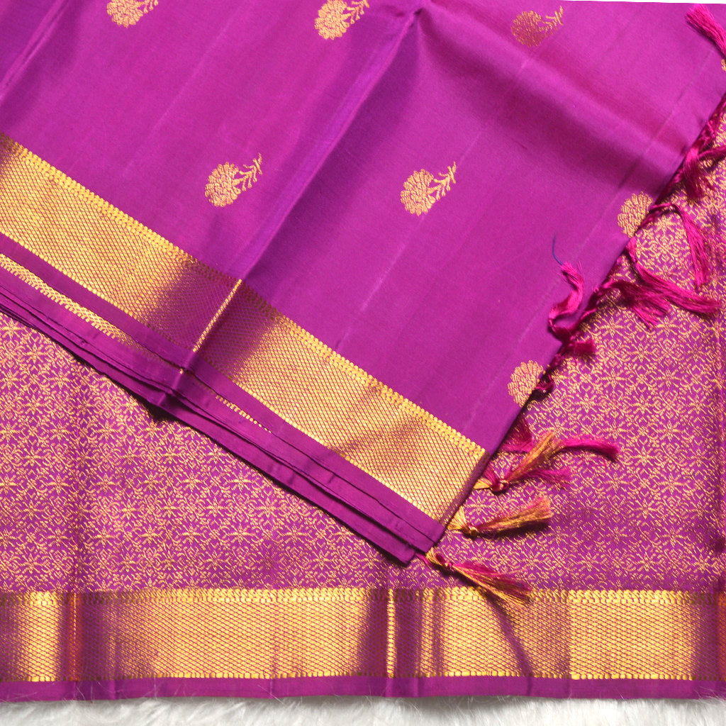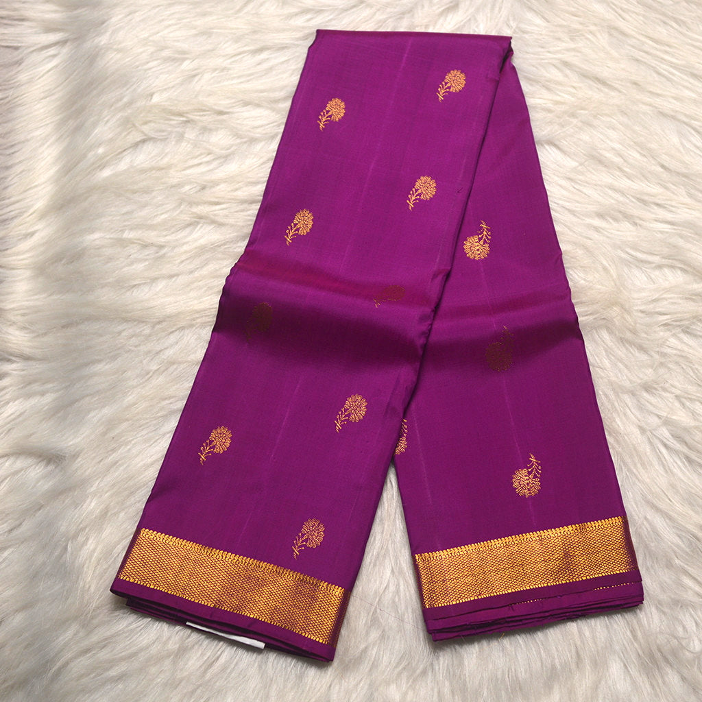Elevate your wardrobe with this exquisite six-yard saree, featuring a rich purple body adorned with intricate full zari putta work. The delicate self-colored pallu and refined small border create a harmonious, understated elegance. Perfect for traditional occasions, this piece showcases meticulous craftsmanship and timeless sophistication, blending classic design with premium detailing for the discerning wearer.