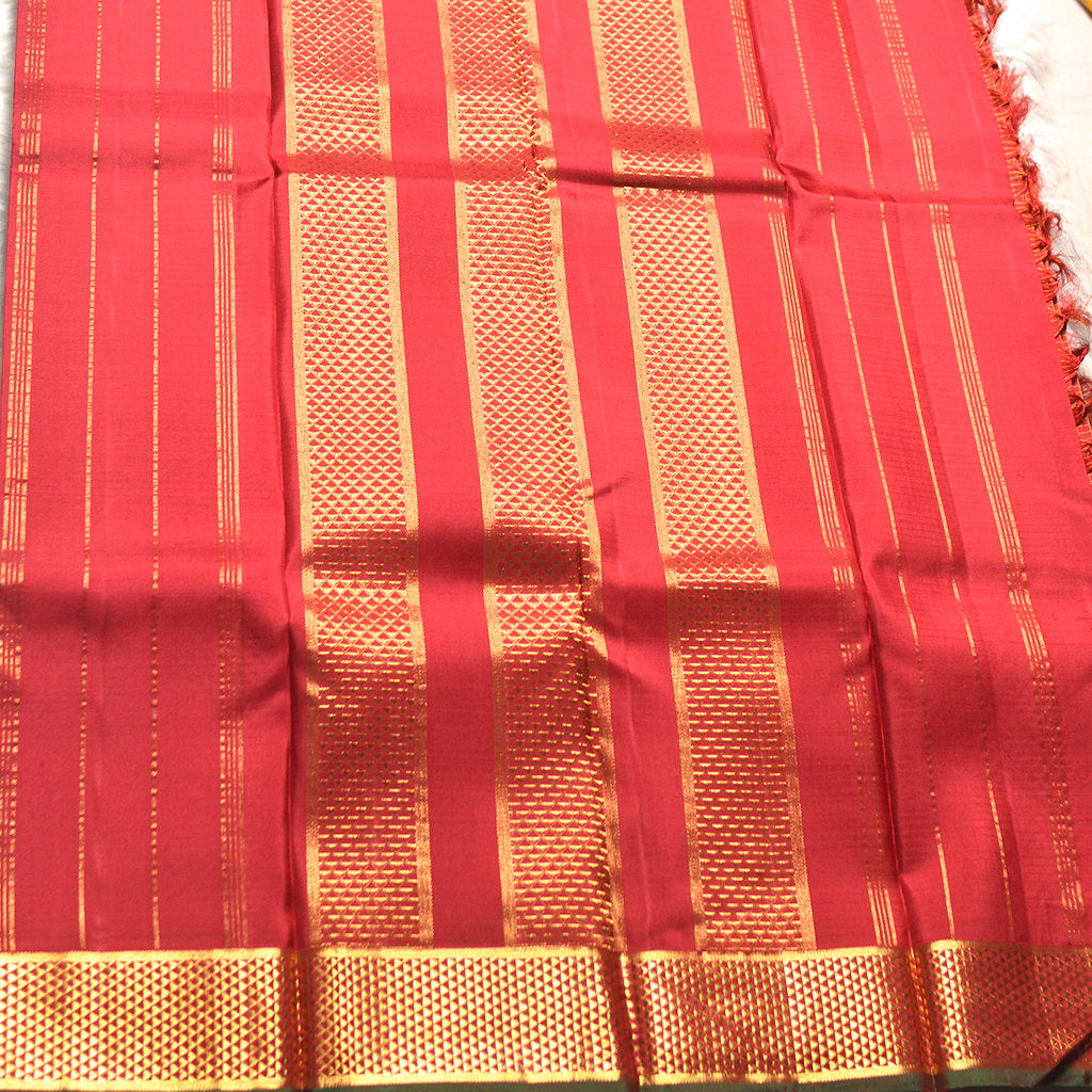 H.V 1077 (6 Yards Saree) This elegant saree features a rich maroon body with intricate small zari detailing throughout. The checked border design adds refined structure, while the mada pet border provides traditional definition. The self-patterned pallu completes this sophisticated piece with understated luxury. Perfect for those who appreciate timeless craftsmanship and premium silk weaving.