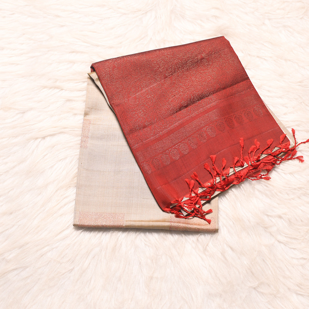Elevate your wardrobe with this exquisite six-yard saree, a masterpiece of traditional craftsmanship. The soft off-white body provides an elegant canvas, while the striking maroon pallu commands attention with its rich, luxurious hue. Intricate copper zari work adorns delicate buttas throughout, creating a refined interplay of light and shadow. Perfect for festive occasions and celebrations, this saree seamlessly blends timeless sophistication with contemporary grace, making it an essential addition to any discerning collection.