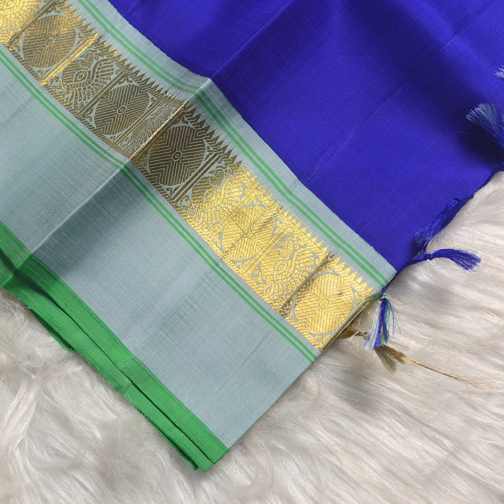 # H.V 4371 ( 6 Yards Saree ) Elevate your wardrobe with this refined 6-yard saree, featuring a sophisticated plain blue body that exudes timeless elegance. The striking gray pallu adds a distinguished contrast, creating a harmonious balance of understated luxury and contemporary style. Crafted with meticulous attention to detail, this piece seamlessly transitions from traditional occasions to modern celebrations. The interplay of cool tones ensures versatility in styling while maintaining an air of refined grace. Perfect for the discerning woman who appreciates quality craftsmanship and subtle sophistication in her ethnic wear.