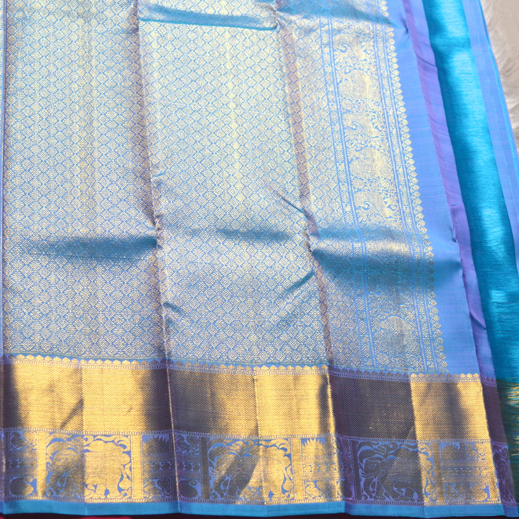 Elevate your wardrobe with this exquisite 6-yard saree, a masterpiece of traditional craftsmanship. The soft pink body is adorned with intricate zari buttis that catch the light with every movement, while the striking Ananda blue pallu adds a bold contrast. A broad, self-patterned border frames the entire drape with refined elegance. Perfect for weddings, celebrations, and special occasions, this saree combines timeless design with premium quality, ensuring you make an unforgettable impression.