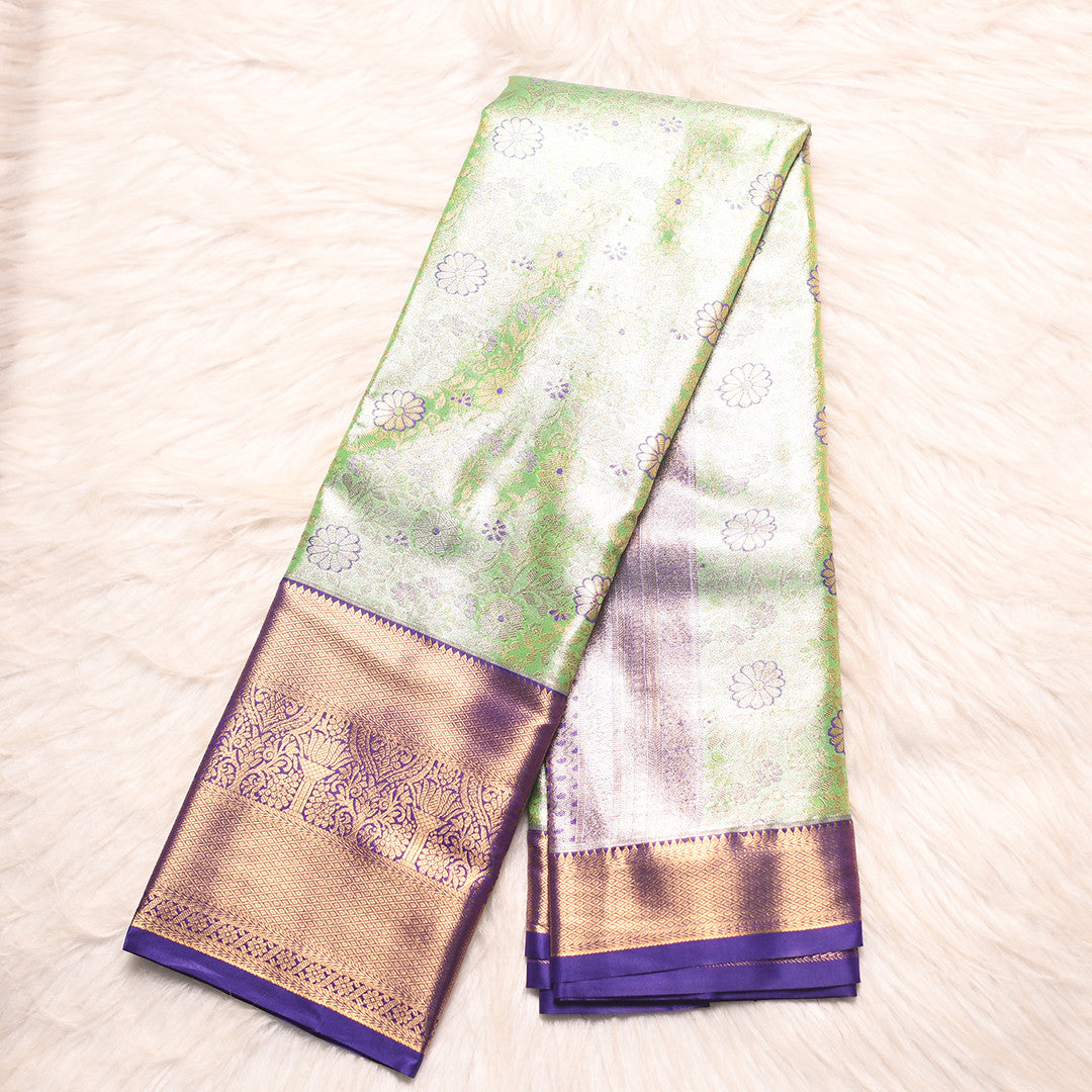 H.V 5017 presents an elegant six-yard saree that seamlessly blends contemporary design with traditional craftsmanship. The verdant green body creates a serene foundation, while the striking purple border adds a regal dimension to this sophisticated ensemble. The coordinating purple pallu completes the composition with refined grace, making this piece ideal for festive occasions and formal gatherings. Crafted with meticulous attention to detail, this saree exemplifies timeless elegance and premium quality that discerning patrons of fine textiles appreciate.