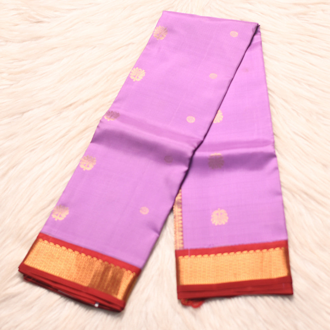 Draped in luxurious pure silk, this elegant six-yard saree features a striking purple body adorned with delicate buttas that catch the light beautifully. The rich maroon border and matching pallu create a refined contrast, adding depth and grandeur to the ensemble. Perfect for festive occasions and celebrations, this sophisticated piece showcases traditional craftsmanship with a contemporary sensibility. The premium silk fabric ensures a graceful drape and lasting comfort throughout wear.