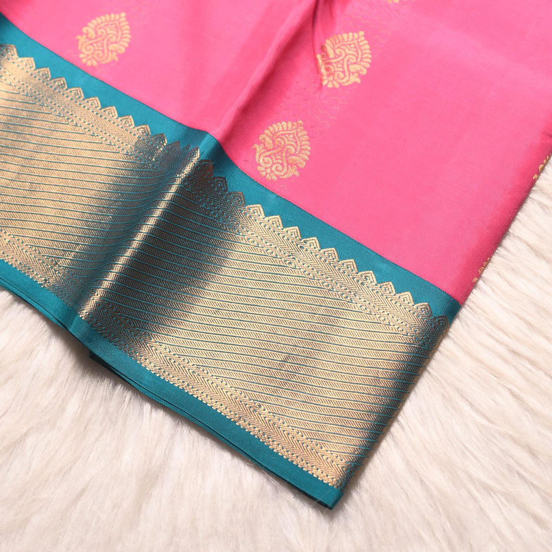 Draped in delicate pink with intricate scattered buttis, this six-yard saree exudes timeless elegance. The contrasting sky blue border and pallu add a refined touch, creating a harmonious interplay of colors that elevates any occasion. Perfect for those who appreciate understated sophistication and traditional craftsmanship, this piece seamlessly blends classic design with contemporary sensibility. Ideal for celebrations, festivals, or refined everyday wear.