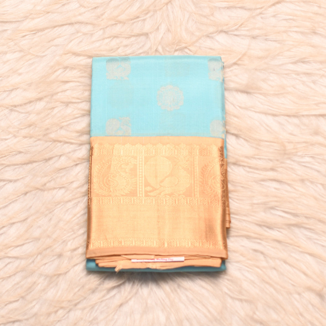 Drape yourself in timeless elegance with this exquisite 6-yard saree. The serene sky blue body creates a calming canvas, beautifully complemented by a crisp off-white border that frames the silhouette with refined simplicity. The rich pallu serves as a stunning focal point, adding depth and grandeur to your ensemble. Perfect for celebrations and formal occasions, this saree combines traditional craftsmanship with sophisticated styling. Ideal for those who appreciate understated luxury and classic beauty.
