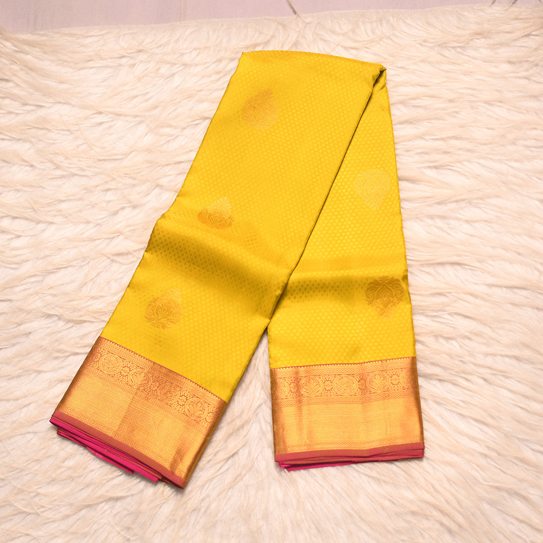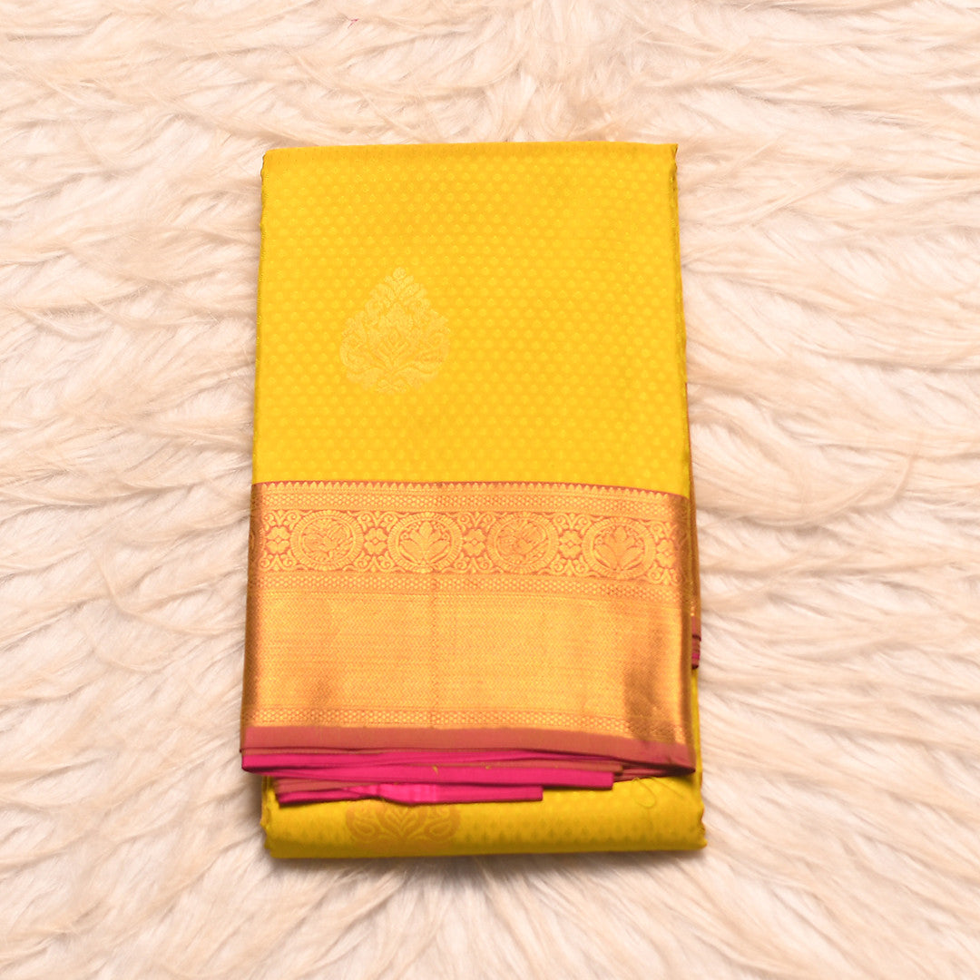Drape yourself in timeless elegance with this exquisite 6-yard saree that seamlessly blends vibrant hues. The luminous yellow body creates a radiant canvas, while the striking pink pallu adds a sophisticated contrast that elevates your traditional ensemble. Perfect for festive occasions and celebrations, this saree showcases the refined craftsmanship synonymous with premium silk wear. The harmonious color interplay ensures you stand out with grace and poise, making it an essential addition to your collection.