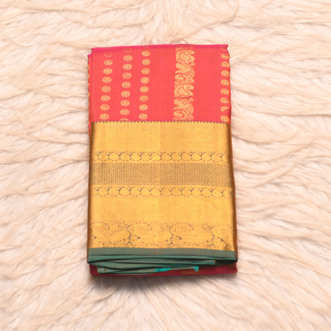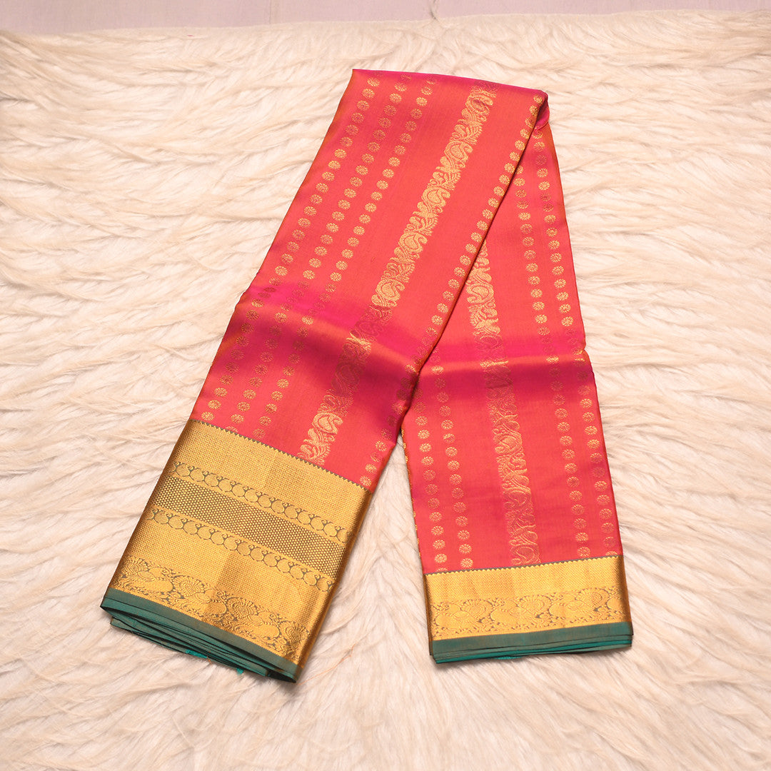 Light orange silk saree with an exquisite sapphire blue pallu that commands attention. The body features delicate jari buttis scattered throughout, adding refined elegance to every drape. The pallu showcases rich embellishment with intricate detailing, making this a versatile choice for both festive occasions and celebrations. The harmonious blend of warm and cool tones creates a sophisticated aesthetic that flatters all complexions. Perfect for the discerning wearer who appreciates traditional craftsmanship with contemporary appeal.