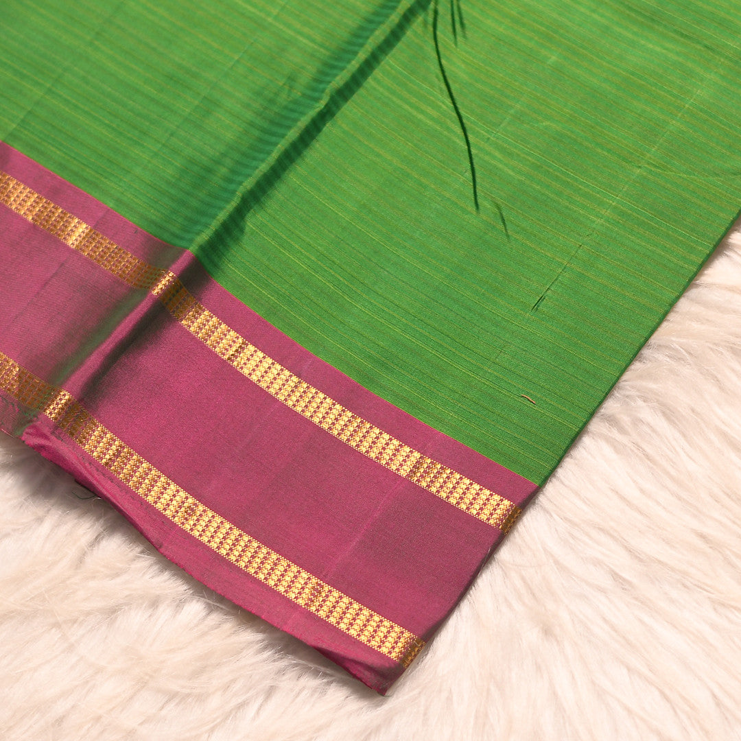 Elevate your wardrobe with this exquisite six-yard saree, crafted from pure silk for unparalleled elegance and comfort. The verdant green body provides a timeless canvas, while the striking purple border frames the silhouette with refined contrast. The coordinating purple pallu adds a sophisticated finishing touch, perfect for both traditional occasions and contemporary styling. Double silk construction ensures durability and a luxurious drape that moves gracefully with every step. An investment piece that celebrates authentic craftsmanship and timeless beauty.