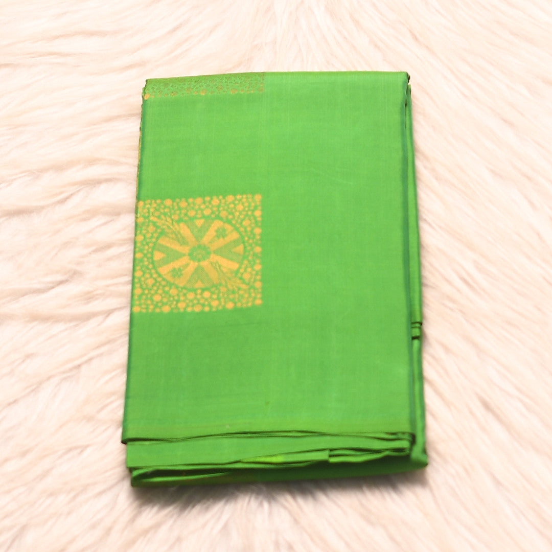 # Product Description Elevate your wardrobe with this refined 6-yard saree, a masterpiece of understated elegance. Draped in a serene green hue, this piece celebrates minimalist sophistication with its clean, border-less design that allows the fabric's natural beauty to shine. The self-patterned pallu adds subtle texture and dimension without overwhelming the composition. Perfect for those who appreciate timeless style and contemporary sensibilities, this saree transitions effortlessly from formal occasions to refined everyday wear. The generous 6-yard length ensures graceful draping and versatile styling options for the discerning wearer.