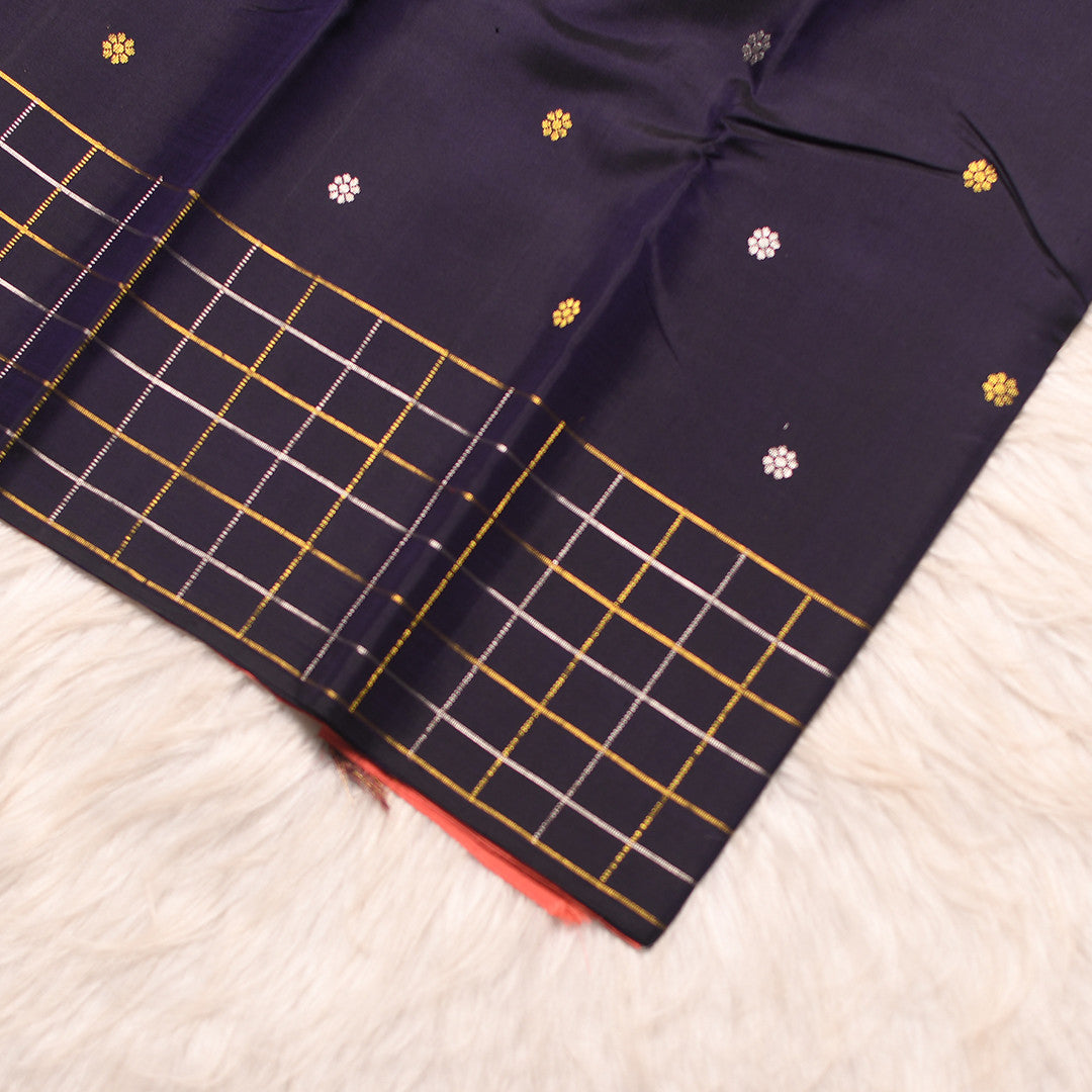 # Product Description Elevate your wardrobe with this exquisite six-yard saree, a masterpiece of traditional craftsmanship. The serene blue body is adorned with delicate small butta motifs that dance across the fabric, creating an understated elegance. A striking checked pattern frames the border, adding geometric sophistication, while the rich red pallu provides a bold, luxurious contrast. Perfect for festive occasions and formal gatherings, this saree seamlessly blends classic design with refined aesthetics. The harmonious interplay of colors and intricate detailing makes it an essential addition to any discerning wardrobe.