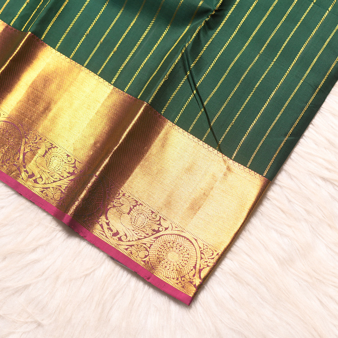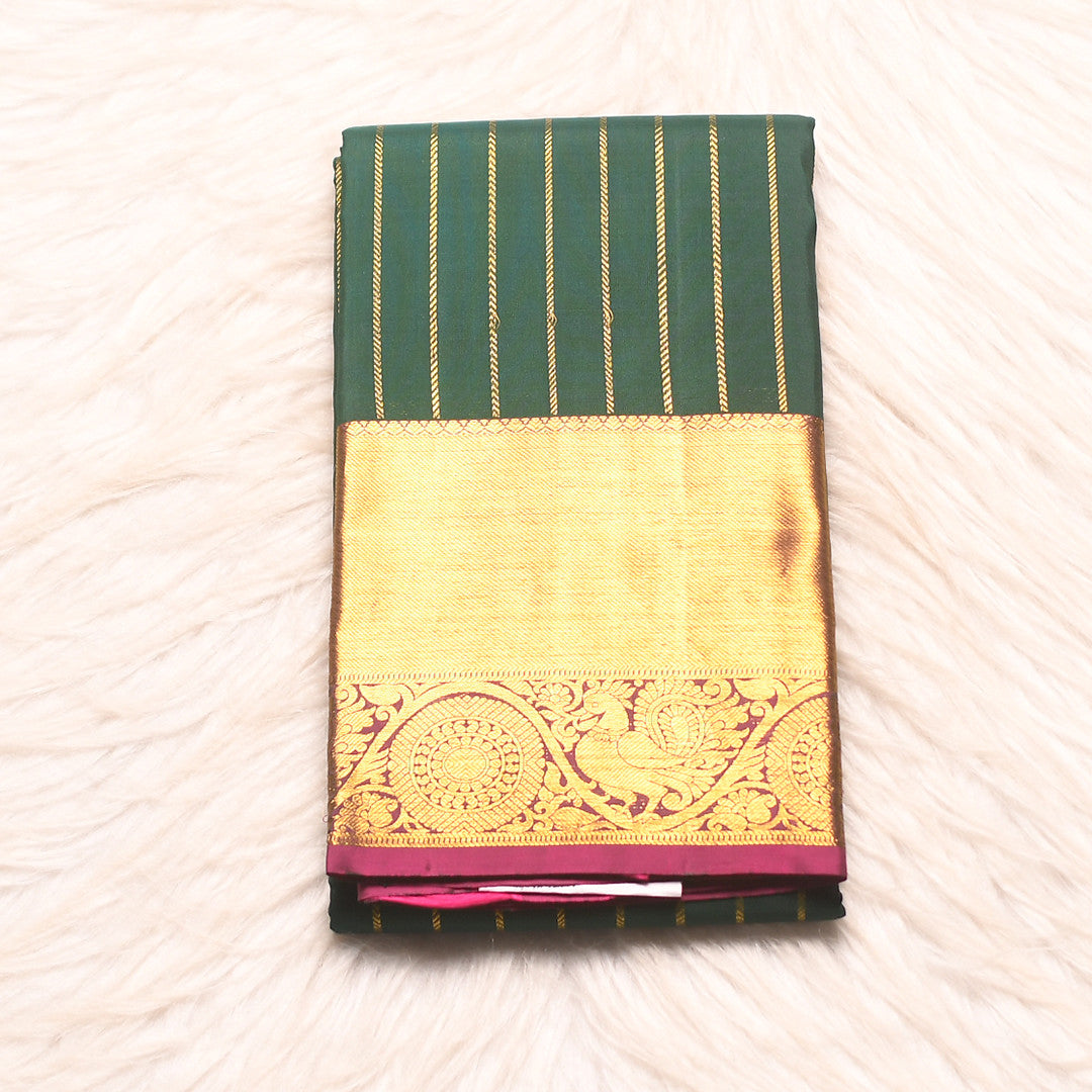 Drape yourself in timeless elegance with this exquisite 6-yard saree, where sophisticated design meets traditional craftsmanship. The verdant green body adorned with delicate stripes creates a refined canvas, while the regal purple pallu adds a striking contrast that elevates any occasion. Perfect for celebrations and formal gatherings, this piece showcases the artistry of premium silk weaving. The harmonious color palette and meticulous detailing make it an essential addition to your collection of luxury Indian textiles.