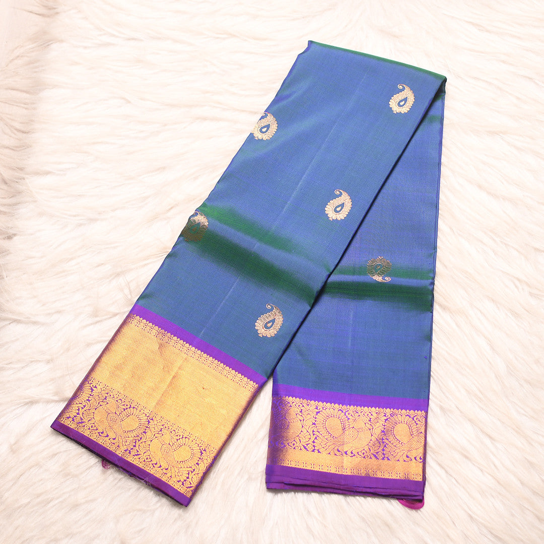 Drape yourself in timeless elegance with this exquisite 6-yard saree, featuring a serene blue body adorned with delicate small buttis that catch the light beautifully. The striking purple border frames the fabric with refined sophistication, while the coordinating purple pallu adds a luxurious finishing touch. Perfect for celebrations and special occasions, this piece combines traditional craftsmanship with a contemporary color palette. The intricate detailing and premium weave make it an investment in enduring style.