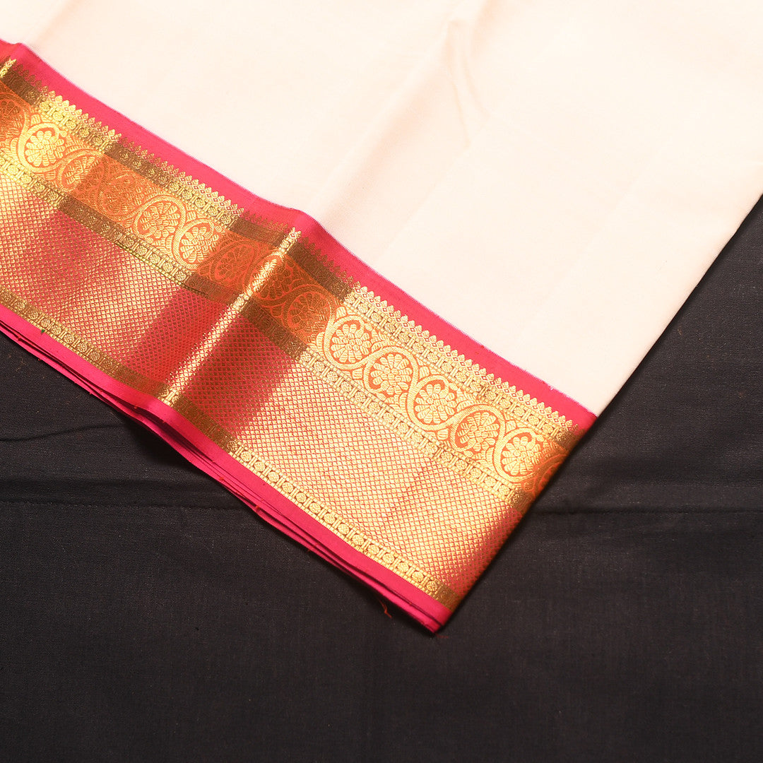 Elevate your wardrobe with this exquisite 6-yard saree, a timeless piece that seamlessly blends classic elegance with contemporary grace. The pristine white body provides a refined canvas, while the striking pink border and pallu add a touch of vibrant sophistication. Crafted with meticulous attention to detail, this saree is perfect for both festive occasions and refined everyday wear. The harmonious contrast between the serene white and rich pink creates an understated yet captivating aesthetic that complements all skin tones. Ideal for the discerning woman who appreciates traditional craftsmanship with modern sensibility.