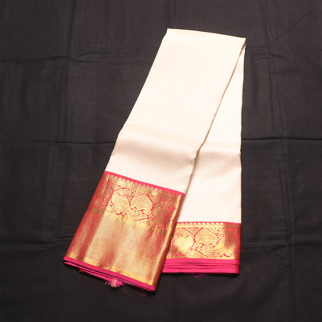 Elevate your wardrobe with this exquisite 6-yard saree, a timeless piece that seamlessly blends classic elegance with contemporary grace. The pristine white body provides a refined canvas, while the striking pink border and pallu create a sophisticated contrast that commands attention. Crafted with meticulous attention to detail, this saree is perfect for both festive occasions and refined everyday wear. The harmonious interplay of white and pink ensures versatility, allowing you to pair it effortlessly with traditional jewelry and accessories. An investment in timeless style and uncompromising quality.