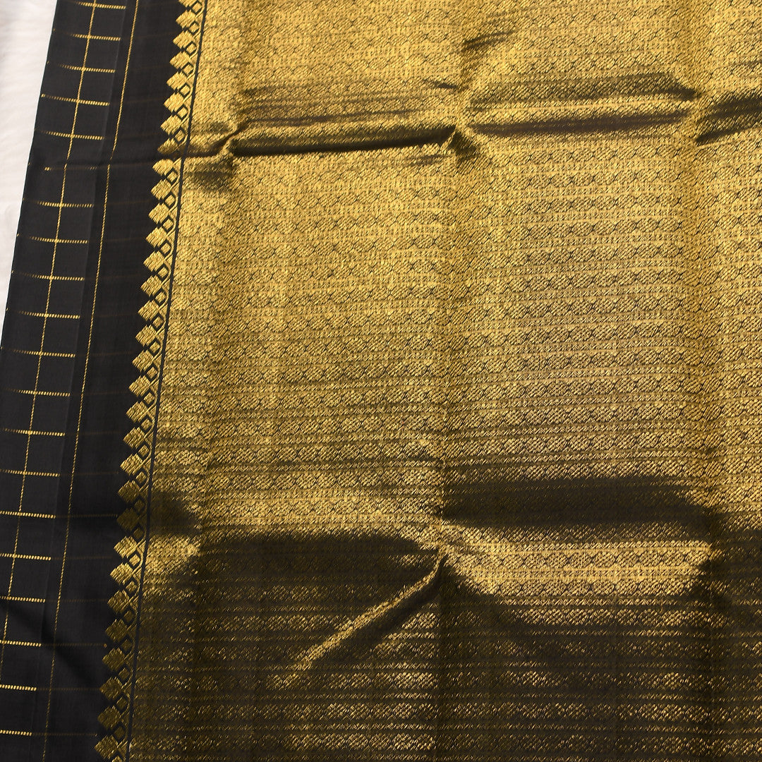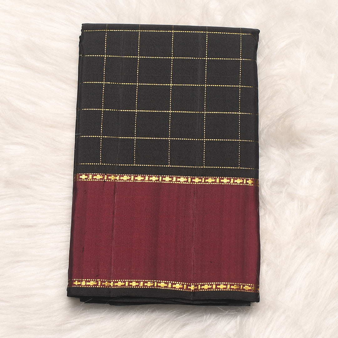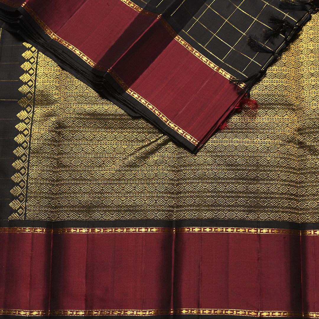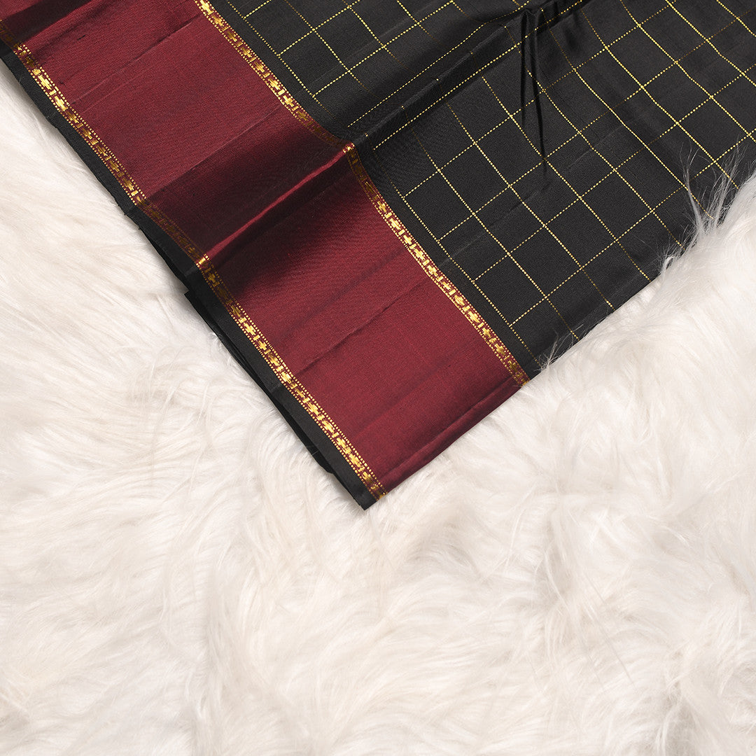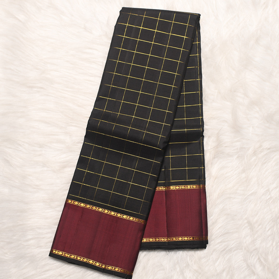 Experience timeless elegance with this pure Kanchipuram silk sari in striking black adorned with golden checks. The rich maroon border features intricate zari design lines that add refined sophistication to every drape. Handcrafted from authentic Kanchipuram silk, this sari combines traditional artistry with luxurious comfort, making it an ideal choice for weddings, festivals, and special occasions. The lustrous fabric and exquisite detailing ensure you stand out with grace and poise.