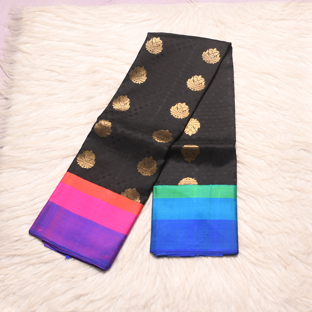# HV-437 (6 Yards Saree) Elevate your wardrobe with this refined six-yard saree, featuring a sophisticated black body adorned with delicate small butta detailing. The contrasting pink pallu adds an elegant finishing touch, while the traditional dabula border frames the piece with timeless grace. Crafted for the discerning wearer who appreciates understated luxury and classic design, this saree seamlessly transitions from everyday elegance to special occasions. The harmonious interplay of black, pink, and intricate embellishments reflects superior craftsmanship and enduring style.