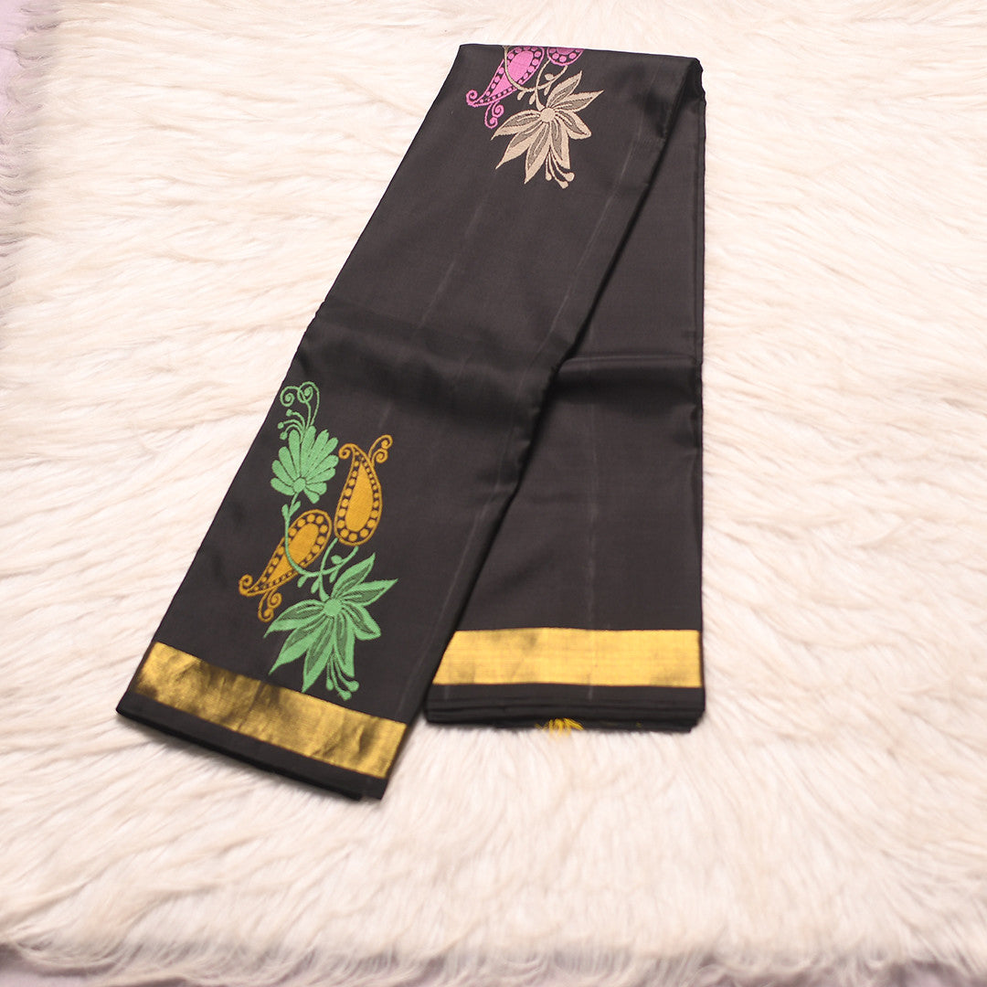 Elevate your wardrobe with this sophisticated six-yard saree, featuring a striking black body that exudes timeless elegance. The self-bordered design and matching pallu create a seamless, refined aesthetic perfect for both traditional occasions and contemporary styling. The understated yet luxurious palette allows the drape and fabric quality to take center stage, making this piece an essential addition to any discerning collection.