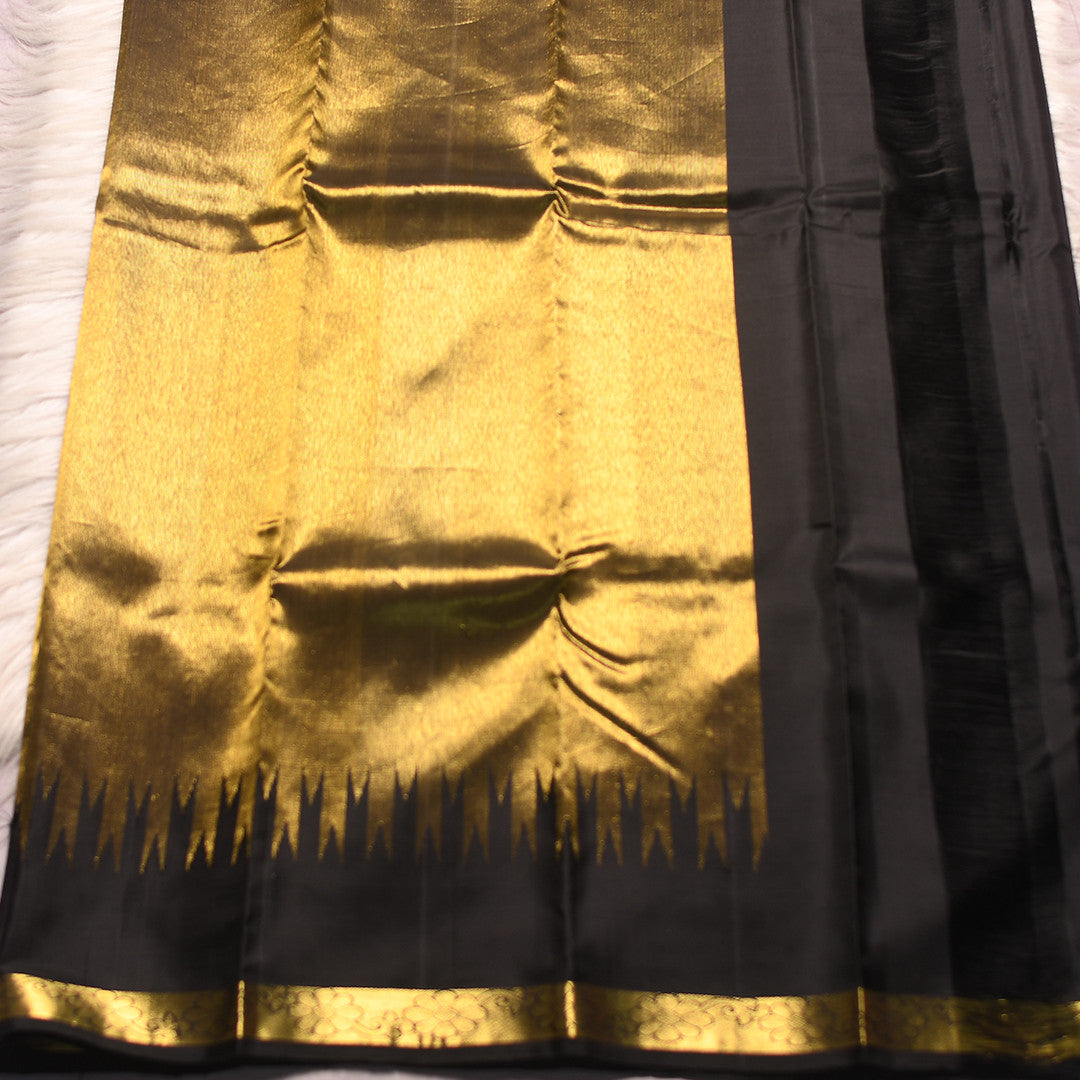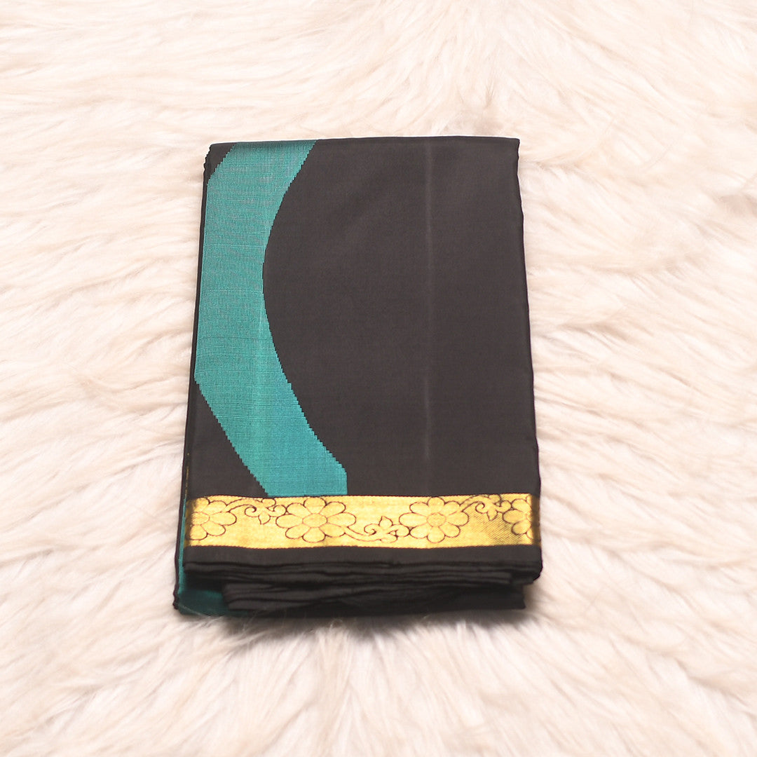 Elevate your wardrobe with this timeless six-yard saree, featuring a striking black body that exudes understated elegance. The saree is adorned with intricate zari detailing along the border and pallu, creating a refined contrast that catches light beautifully. Self-patterned weaving adds subtle texture and depth, making this piece versatile for both traditional occasions and contemporary styling. Perfect for those who appreciate classic sophistication with luxurious craftsmanship.