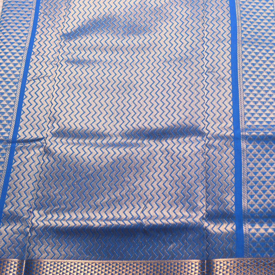 Elevate your wardrobe with this exquisite 9-yard saree, a timeless piece that seamlessly blends tradition with refined elegance. The rich blue body showcases intricate zari butta work, creating a mesmerizing pattern that catches light with every movement. The self-bordered design maintains a cohesive aesthetic, while the ornate pallu serves as a stunning focal point, adorned with elaborate zari detailing. Perfect for weddings, celebrations, and formal occasions, this saree embodies the finest craftsmanship of traditional Indian weaving. Drape it with confidence and grace.
