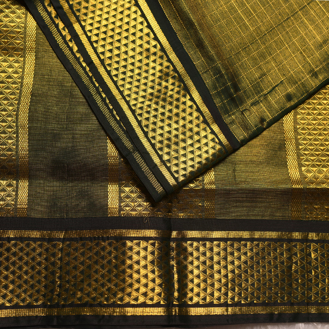 Elevate your wardrobe with this exquisite 10-yard saree, a timeless piece crafted for the discerning wearer. The rich green body features an intricate jari-checked tissue weave that catches light with every movement, creating an understated yet captivating shimmer. The self-bordered design and coordinating self-pallu maintain a refined aesthetic, allowing the fabric's natural elegance to take center stage. Perfect for both traditional occasions and contemporary styling, this saree embodies the artistry of premium silk craftsmanship.
