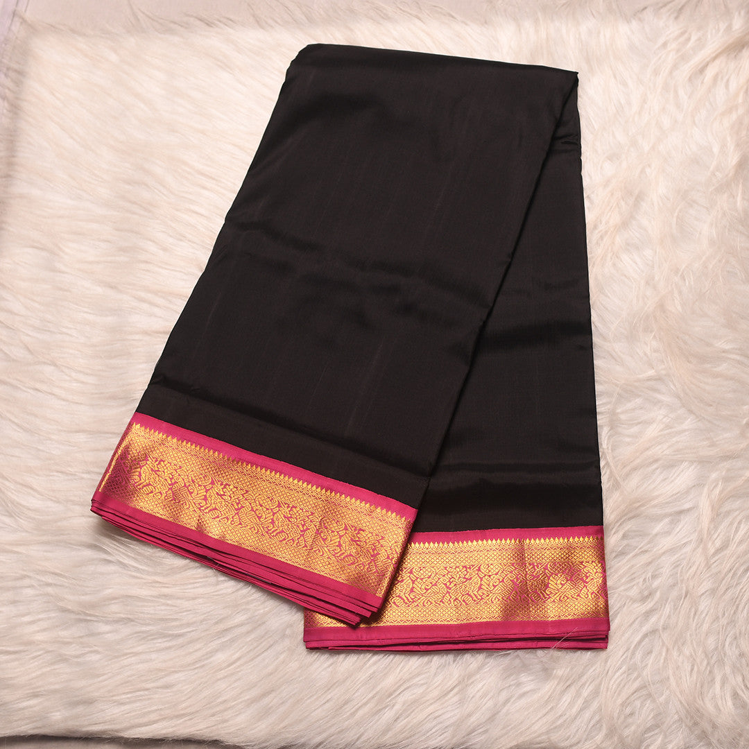 # L 83 (10 Yards Saree) Draped in luxurious black silk, this 10-yard saree exudes timeless elegance with its striking contrast. The delicate pink border frames the fabric with refined grace, while the ornate pink pallu serves as a stunning focal point. Perfect for traditional occasions and celebrations, this piece combines classic sophistication with contemporary styling versatility. The generous length allows for multiple draping styles, making it an essential addition to any discerning wardrobe.